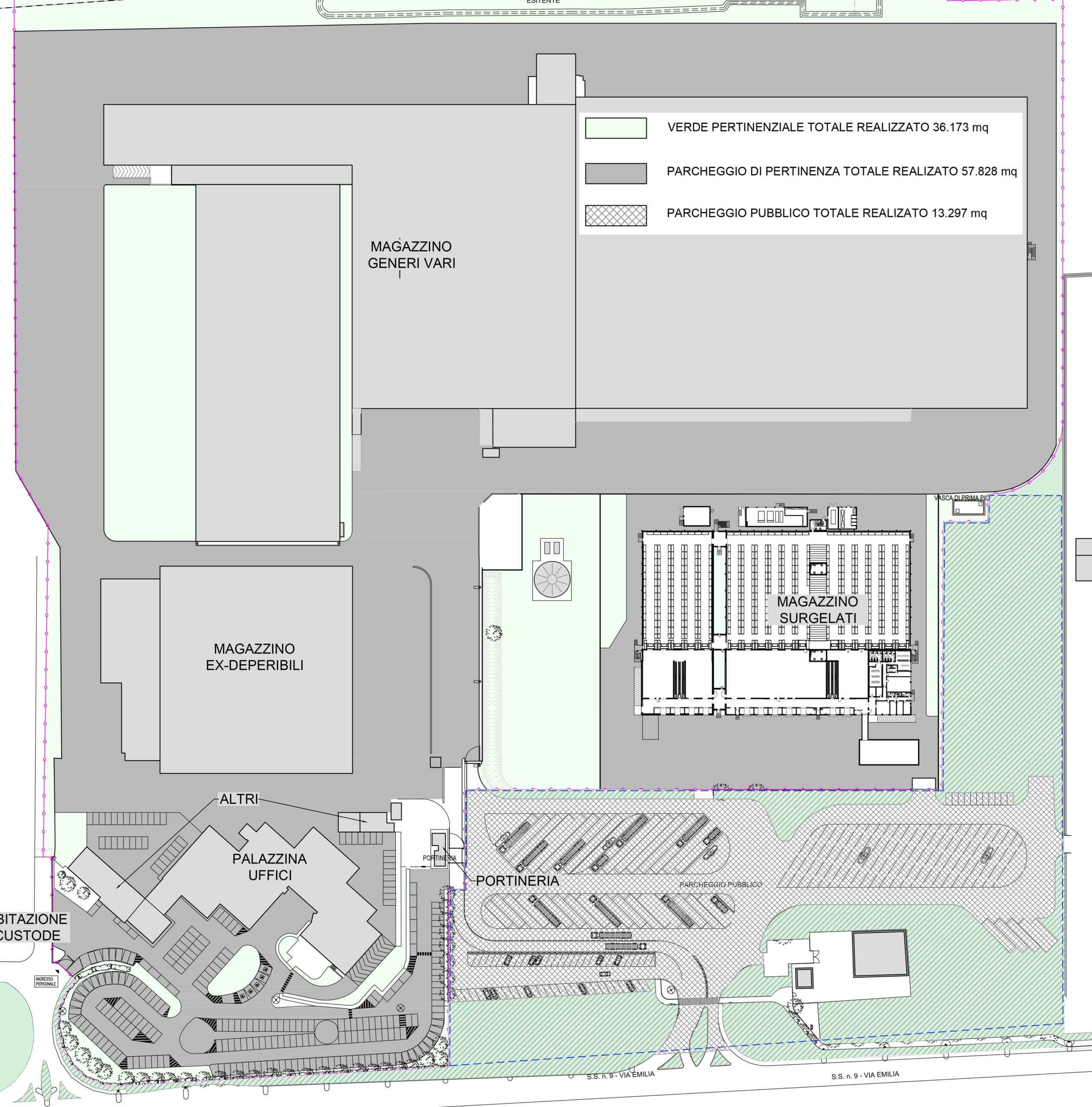 L’intervento prevede la costruzione di un nuovo edificio industriale, con caratteristiche edilizie e funzionali analoghe alla cella frigorifera esistente. Il nuovo volume si collega direttamente al fabbricato attuale e ospita le medesime attività di deposito merci surgelate, senza variazioni di destinazione d’uso.