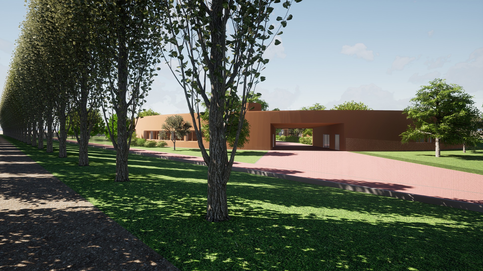 Il tema del progetto è quello di fornire un luogo sicuro e integrato al contesto esistente; per questo motivo il nuovo polo per l’infanzia si presenta come un edificio a pianta circolare, in modo da creare un cortile interno isolato dal contesto circostante.