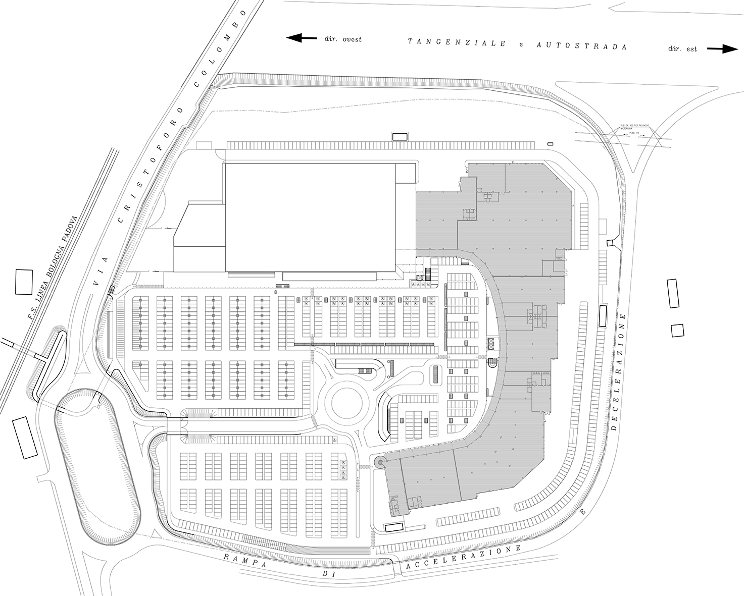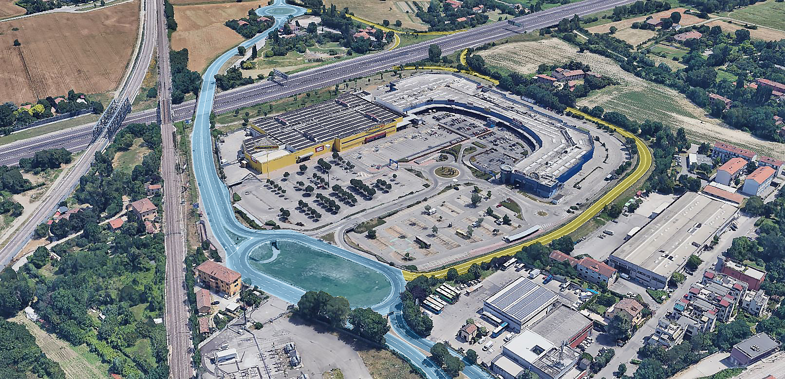 • progettato per garantire un collegamento ottimale con la viabilità esistente, si raccorda con la viabilità esterna attraverso una rotatoria ovale