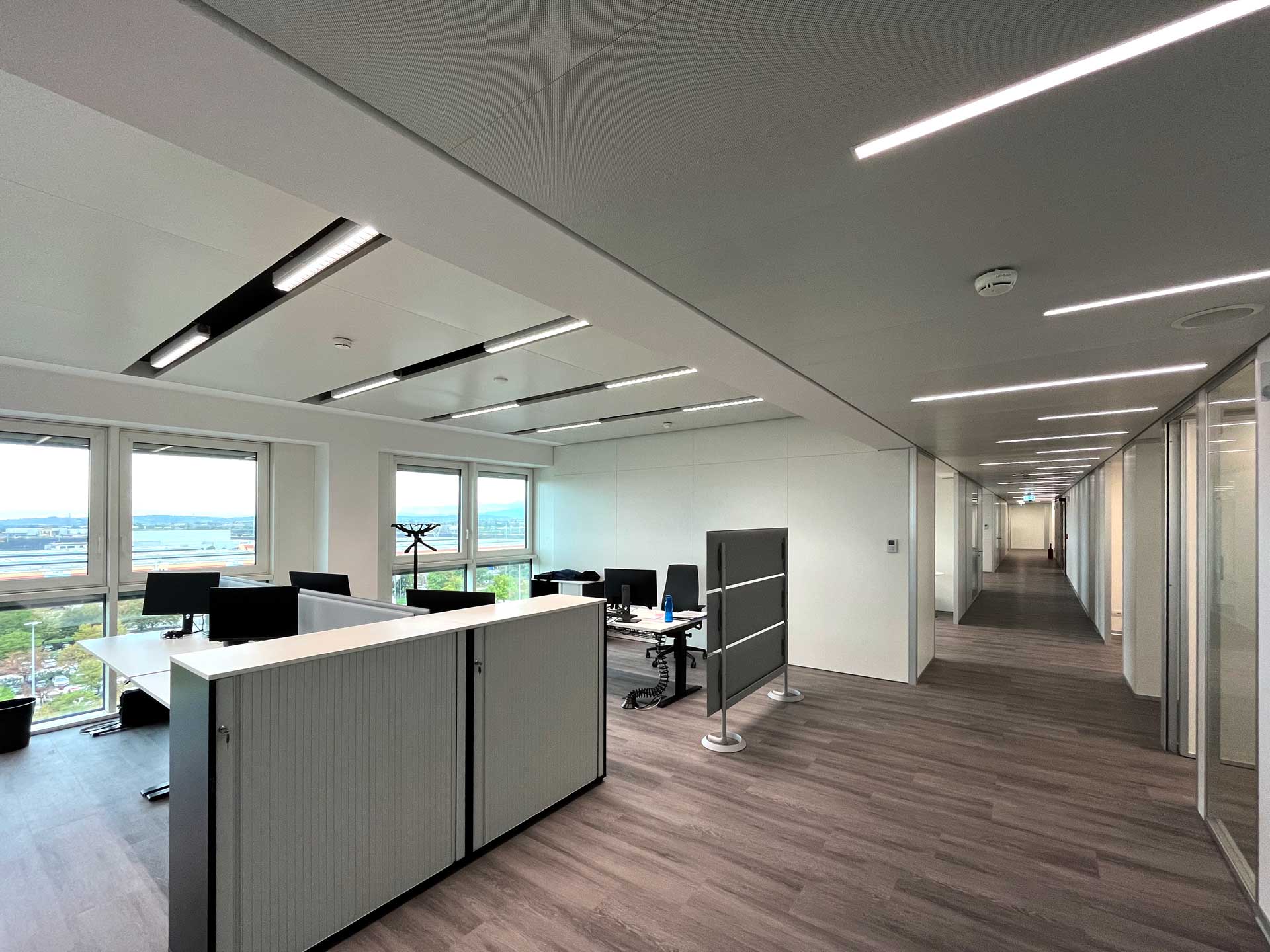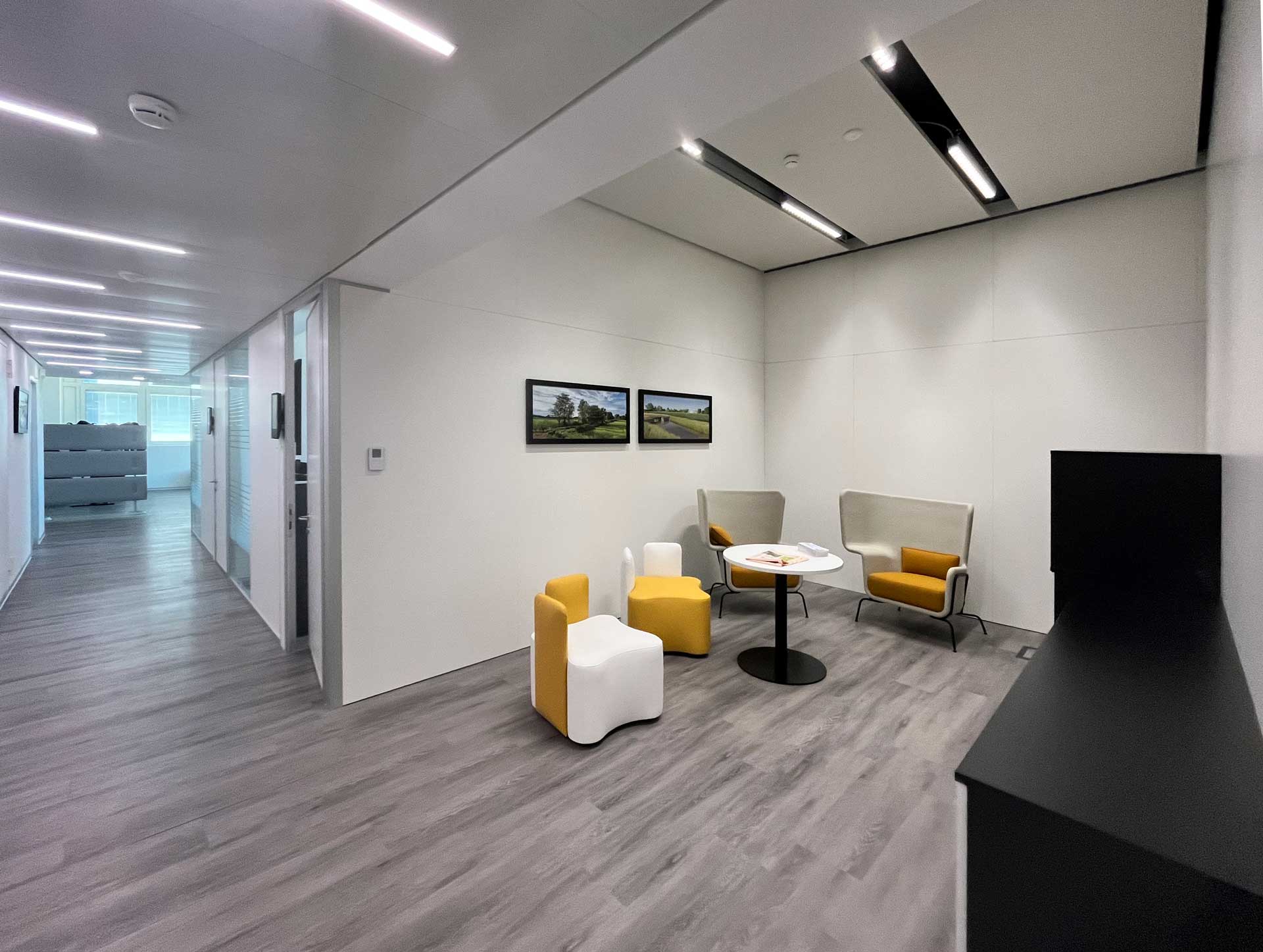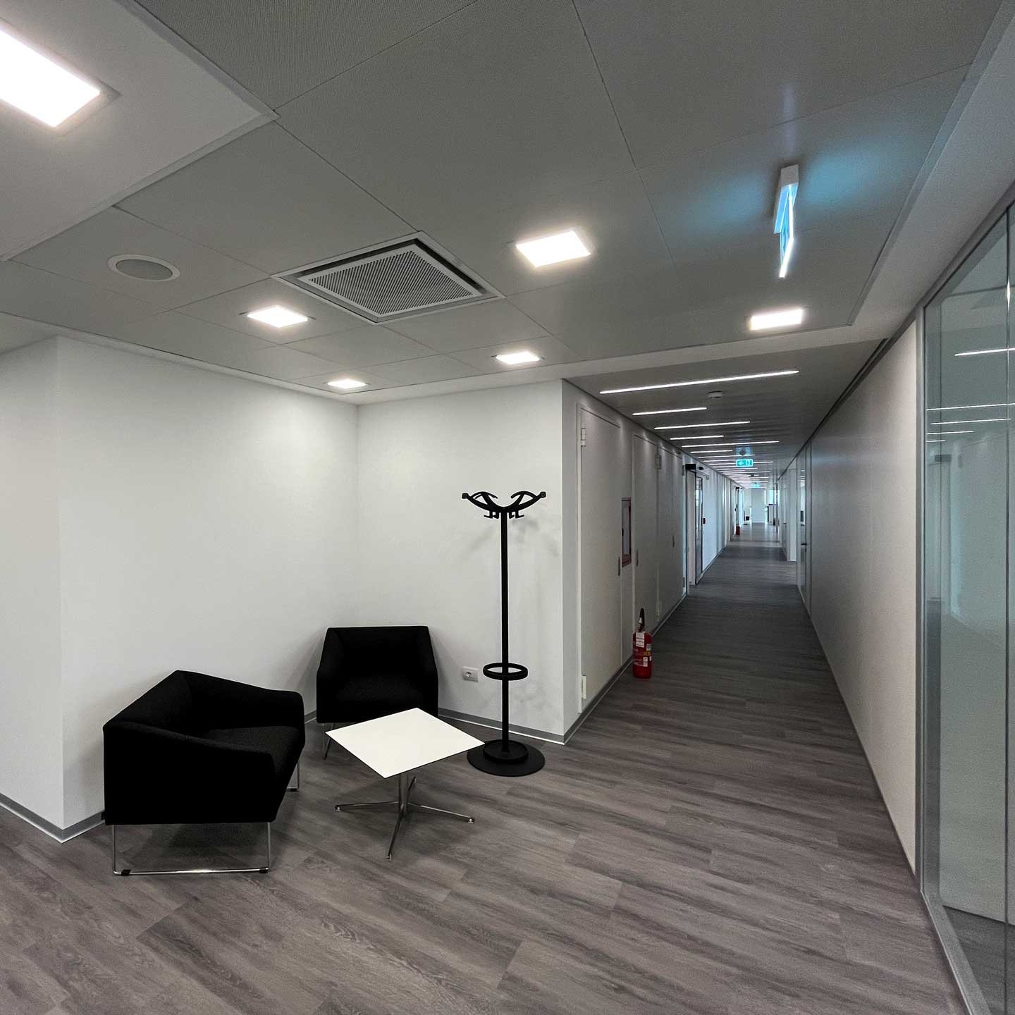 Gli spazi interni sono stati riorganizzati secondo i principi dello smart office: sono stati realizzati ampi open-space intervallati da spazi di aggregazione come sale riunioni, area relax, meeting point dotati di arredi ergonomici per favorire la condivisione e la collaborazione tra dirigenti e personale operativo.